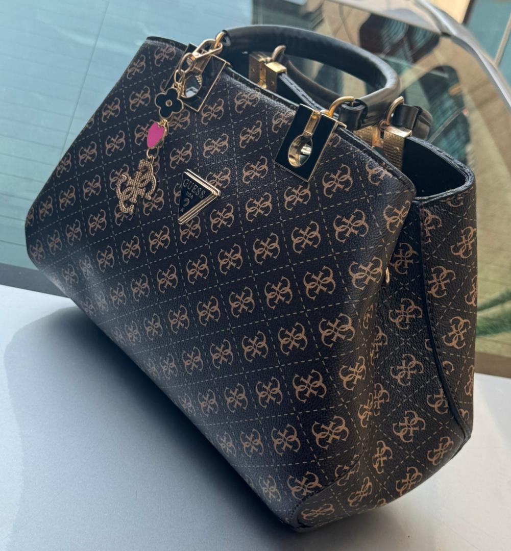 • Signature Hardware: Features the iconic Guess USA triangle logo and a detachable multi-link gold charm with heart and “G” emblems.